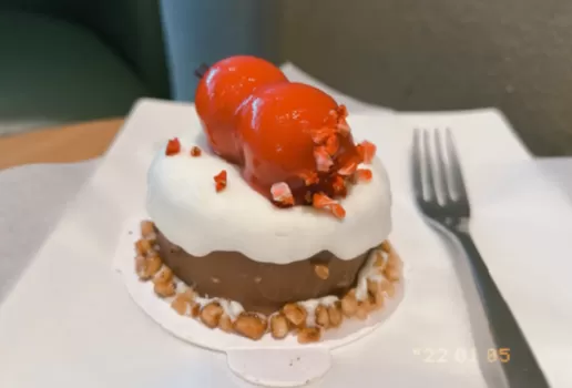 底下一层糖泽小核桃好好吃,一大早出品的整个蛋糕口感很新鲜,山楂造型里面是山楂慕斯,不是特别酸的那种,山楂梗是巧克力做的,整体是一个甜而不腻的蛋糕,不错,除了价格有点小贵外,还是值得推荐滴!