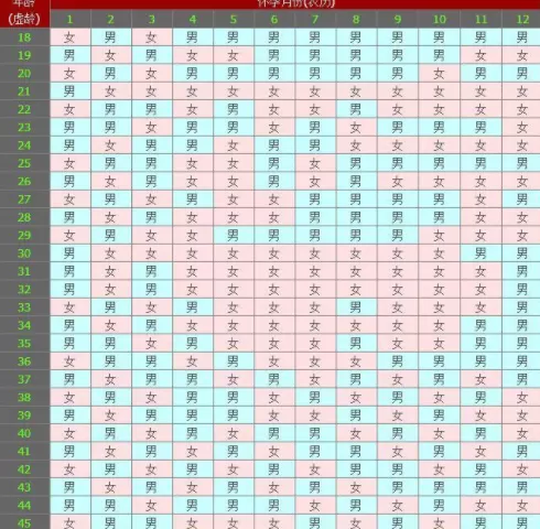 4. 看交点:用受孕女性的虚岁年龄和受孕的农历月份两个信息,对应查看行和列,其交点显示的是女说明是女孩,如果显示男的话就是男孩。