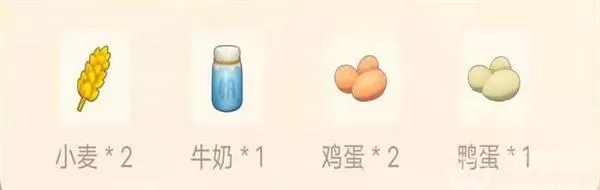 食谱配方:小麦*2、牛奶*1、鸡蛋*2、鸭蛋*1