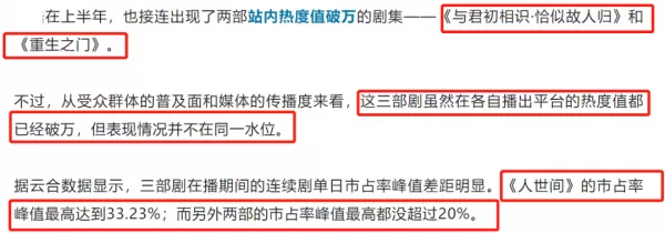 央视网也指出了具体例子,以剧集《人世间》为例,先是纵向对比这部剧在多个平台的数据,同时横向对比另外两部平台热剧《与君初相识》和《重生之门》,直言三部剧在各自播出的平台都得达到热度值破万的好成绩,然而,根据第三方数据平台的内容,《人世间》的市场占有率远超过另外两部剧。