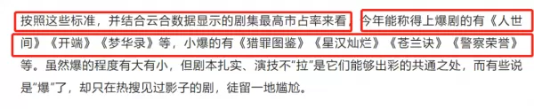 最后,官方还给出了爆剧的标准,并且点名表扬多部爆剧。对于爆剧标准,央视网认为一是看评分,如果平台评分超过7.5,这就是爆剧的基准线,比如《甄嬛传》、《梦华录》。二是参照第三方平台的数据,官方根据这一标准直接列出本年度爆剧名单,包括《人世间》《开端》《梦华录》《猎罪图鉴》《星汉灿烂》《苍兰诀》《警察荣誉》等。