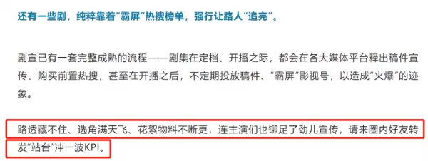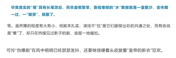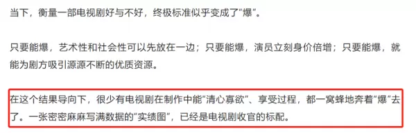 在文章开篇,官方先是点评了近来的爆剧现象,并且解读了爆剧背后的负面影响,犀利指出现在的病态现象,一部剧集只要能"爆",就可以忽略艺术性和社会性,甚至依靠花式营销晋升为爆剧。