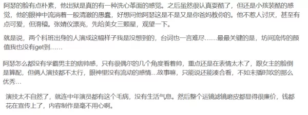 而这种"自说自曝"的方式赢了数据,却赢不来真实的口碑。随后央视网吐槽陈飞宇新作不过是伪爆剧,直言剧本不扎实、演技不过关,等到营销期一过,就只剩下"一地尴尬"。纵观网友的评价也是如此,认为剧方将资本和时间都放在营销上了,在内容方面并没有细心打磨。
