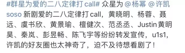 官方所用的截图正是剧集在开播前的营销题目,用众星在线支持的方式,提前为该剧预热。可在播出之后,这部剧却获得全网嘲的效果,杨幂更是凭借一己之力,用油腻的演技状态与男星张翰齐名网络。