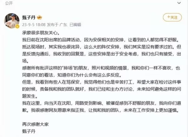 9 月 5 日,针对近日参加活动安保问题引发的争议,老牌港星甄子丹发文道歉:我很感谢网友愿意来指正我,让我和我的团队,未来在工作安排上更加谨慎。