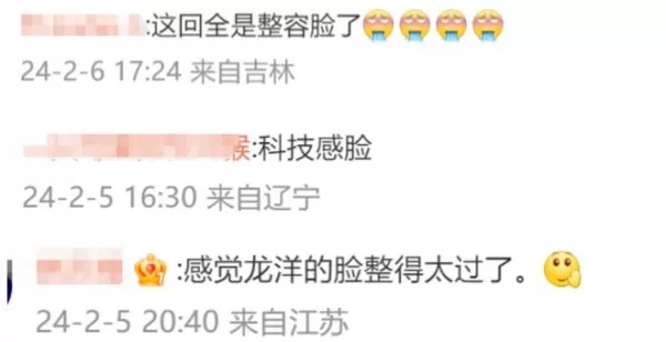 龙洋的长相还有一个更令人争议的地方,那就是有"科技感",不够自然。高清镜头下龙洋脸上的肿胀感更加明显,额头突出,眉眼距离太近。