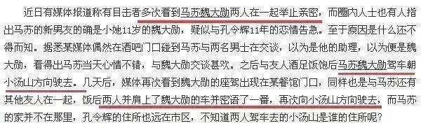 根据媒体爆料,他和马苏一同驾车去小汤山,而当时马苏并没有和孔令辉分手,两人是2013年才官宣分手,魏大勋出现的这个时间点就比较微妙了。