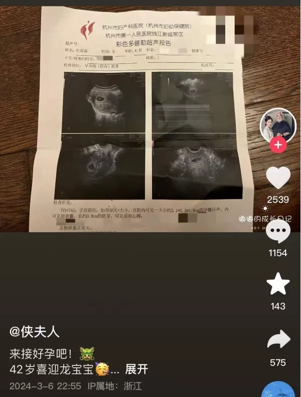 张纪中妻子杜星霖在公开账号上晒出个人写真以及彩超照,官宣再次怀孕。"来接好孕吧!42岁喜迎龙宝宝。孩子是上天的馈赠,是福报!好孕要领:修养身心,培植福德,放松心情。"