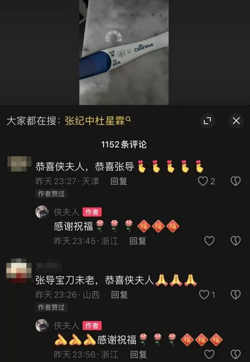 她还在评论区回应各位网友的祝福,有网友称"张导宝刀未老,恭喜侠夫人",杜星霖回应:"感谢祝福!"