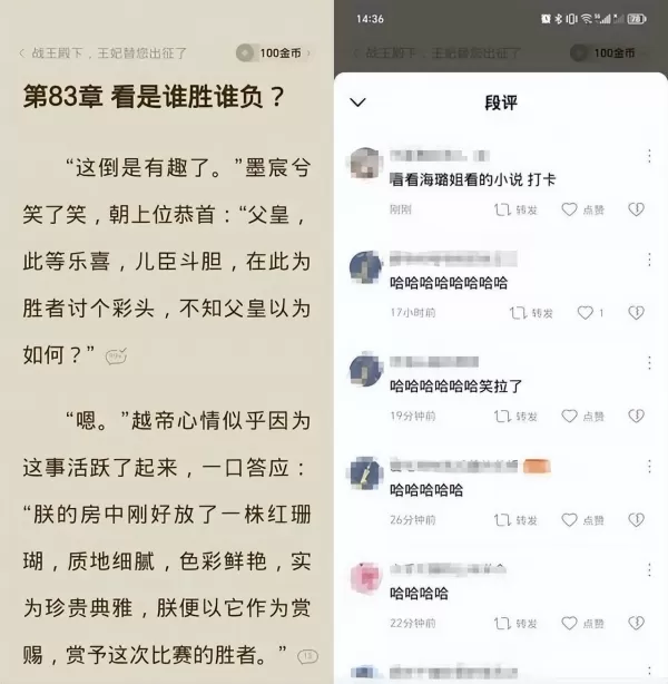 一下子,网友们就迅速扒出了秦海璐看的那本小说,《战王殿下,王妃替您出征了》的第83章!看来这次璐姐学聪明了,没外放小说,可惜还是没躲过"社死"名场面。现在,那本小说的83章评论区可热闹了,全都是姐妹们来打卡的。